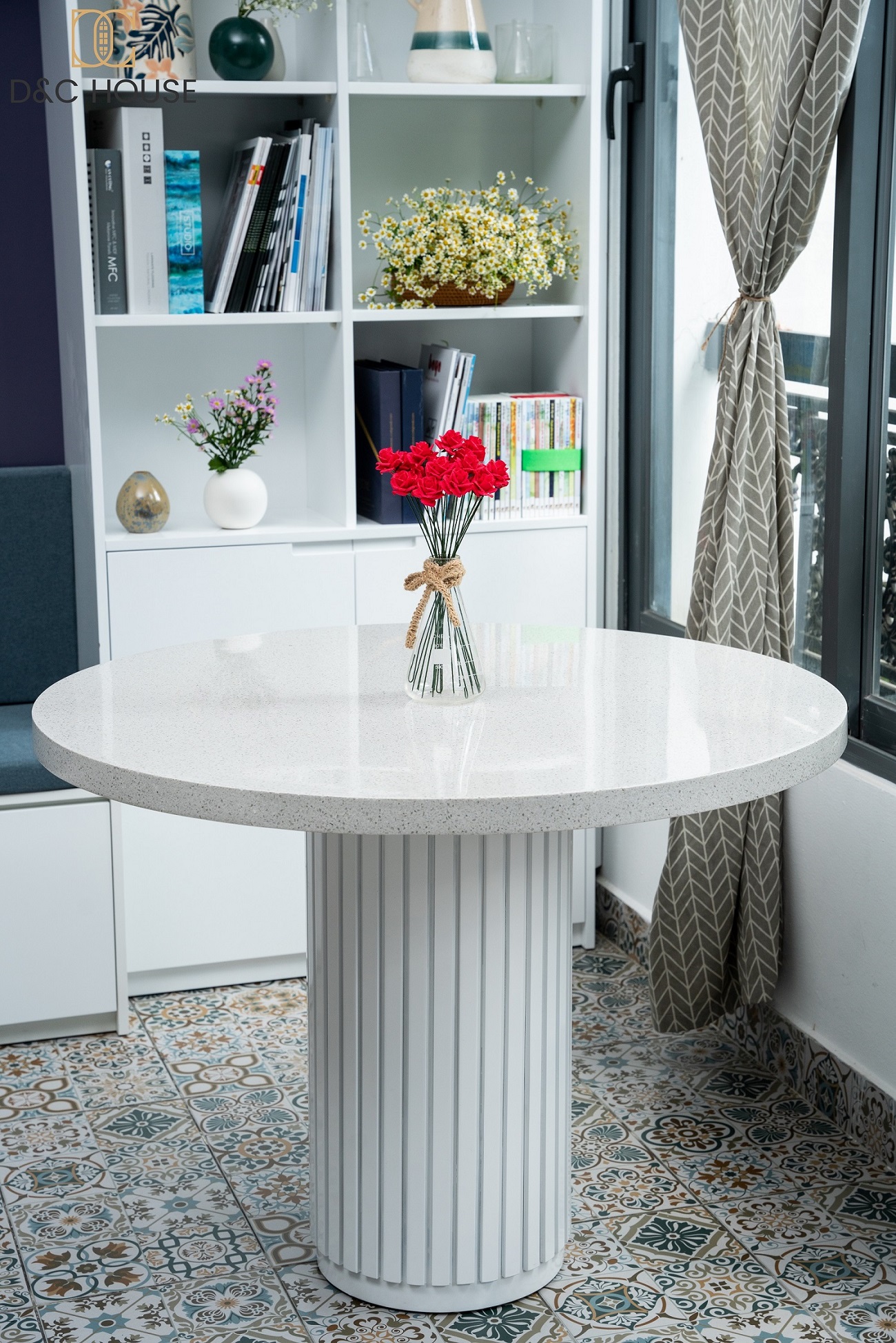 Mặt đá solid surface được nhập khẩu từ Hàn Quốc, mặt đáy ván và chân dùng chất liệu HDF 9mm chống ẩm. Kích thước bàn: D=950x H750 mm.