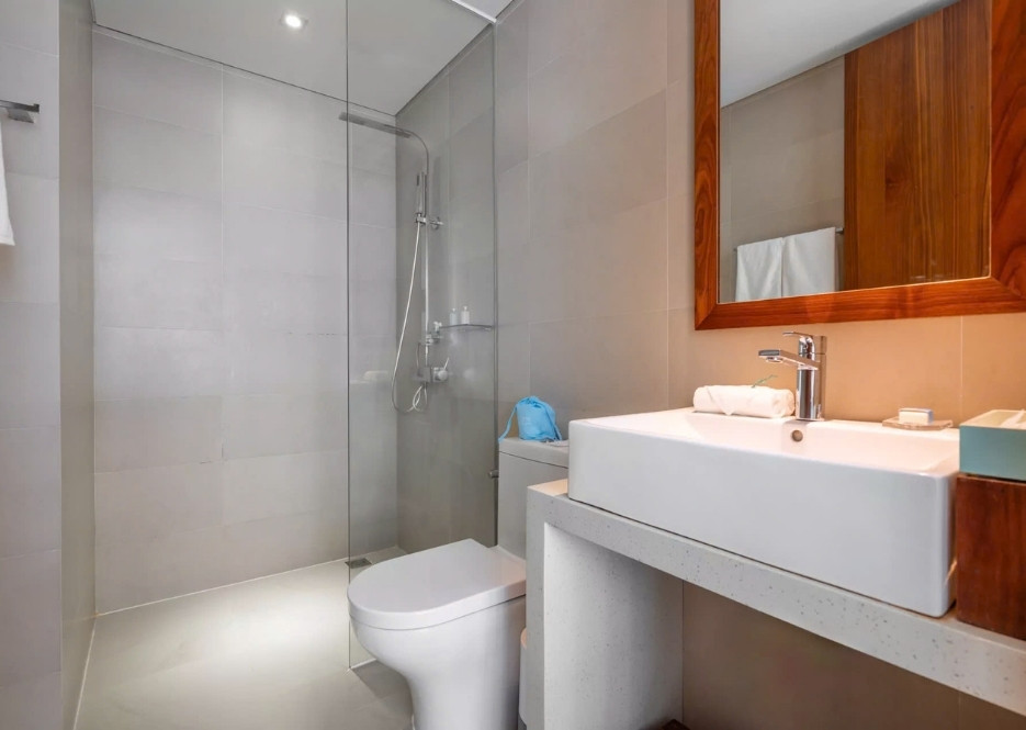 Bề mặt đá Solid Surface nhẵn mịn, không thấm nước và dễ dàng vệ sinh, kết hợp cùng các ngăn chứa đồ thông minh, tạo nên không gian phòng tắm sang trọng và tiện nghi.