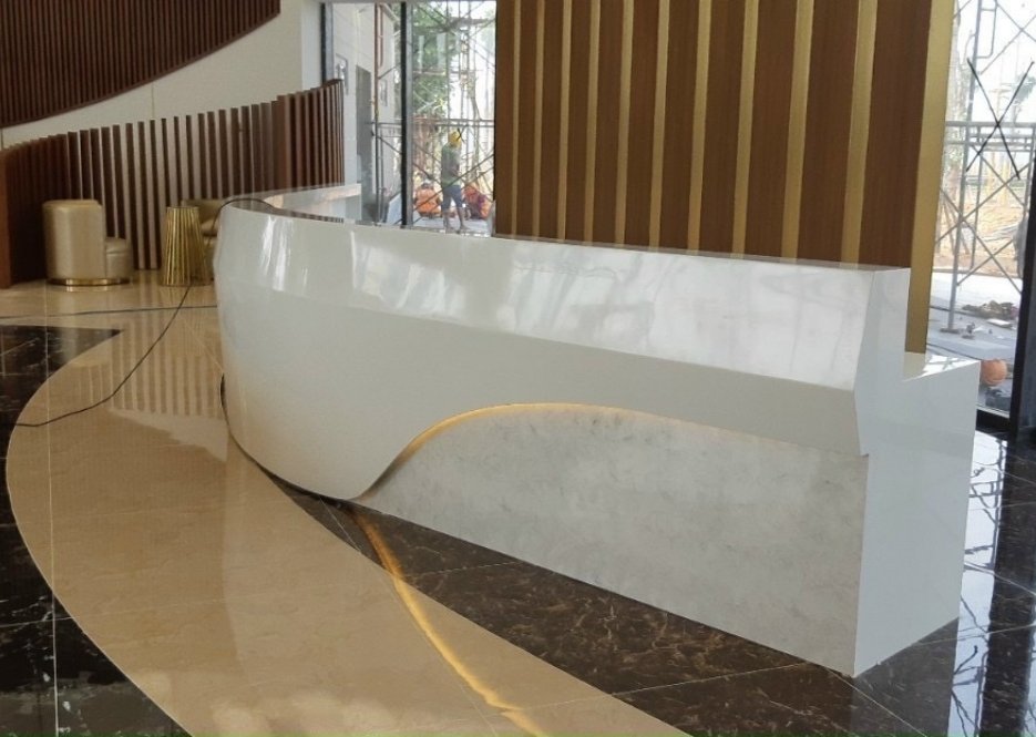 Chúng tôi đã thi công các quầy lễ tân bằng đá Solid Surface cho nhiều dự án của Hưng Thịnh, tạo nên không gian sang trọng và hiện đại.