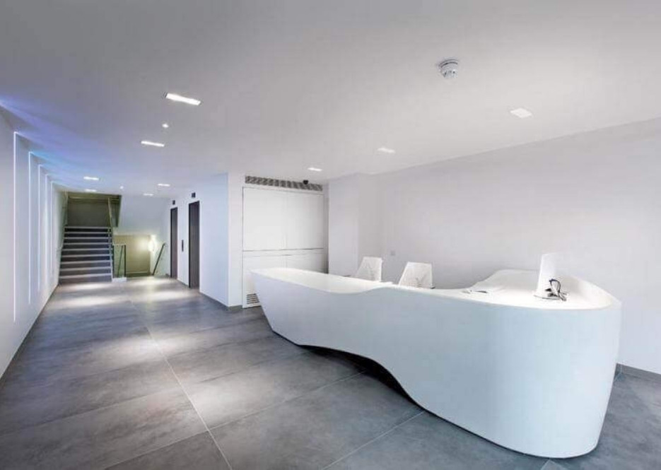 Sự kết hợp giữa màu sắc độc đáo và hiệu ứng ánh sáng tinh tế đã tạo nên một không gian quầy lễ tân ấn tượng, thu hút mọi ánh nhìn.
