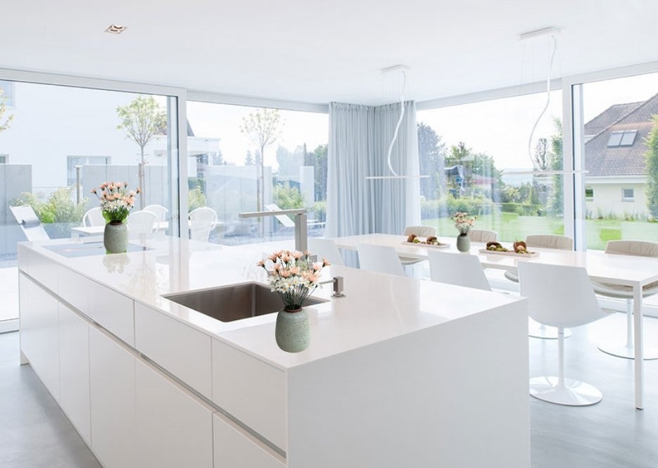 3. Gợi ý bố trí bình hoa BT02 trên đảo bếp đá Solid Surface