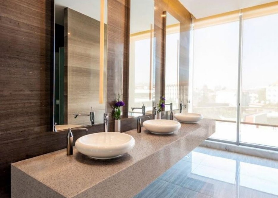 Độ bền và tính dễ dàng vệ sinh của đá Solid Surface giúp đảm bảo không gian luôn sạch sẽ và đẹp mắt, góp phần nâng cao trải nghiệm thư giãn của khách hàng.