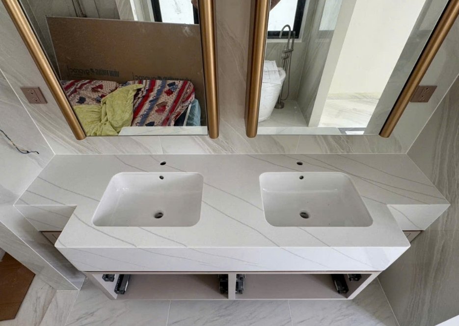 Thẩm mỹ tinh tế: Đá Solid Surface cho phép đúc nguyên khối hoặc ghép nối liền mạch, không để lộ mối nối, tạo nên một tổng thể lavabo đôi hoàn hảo, mịn màng và vô cùng đẳng cấp.