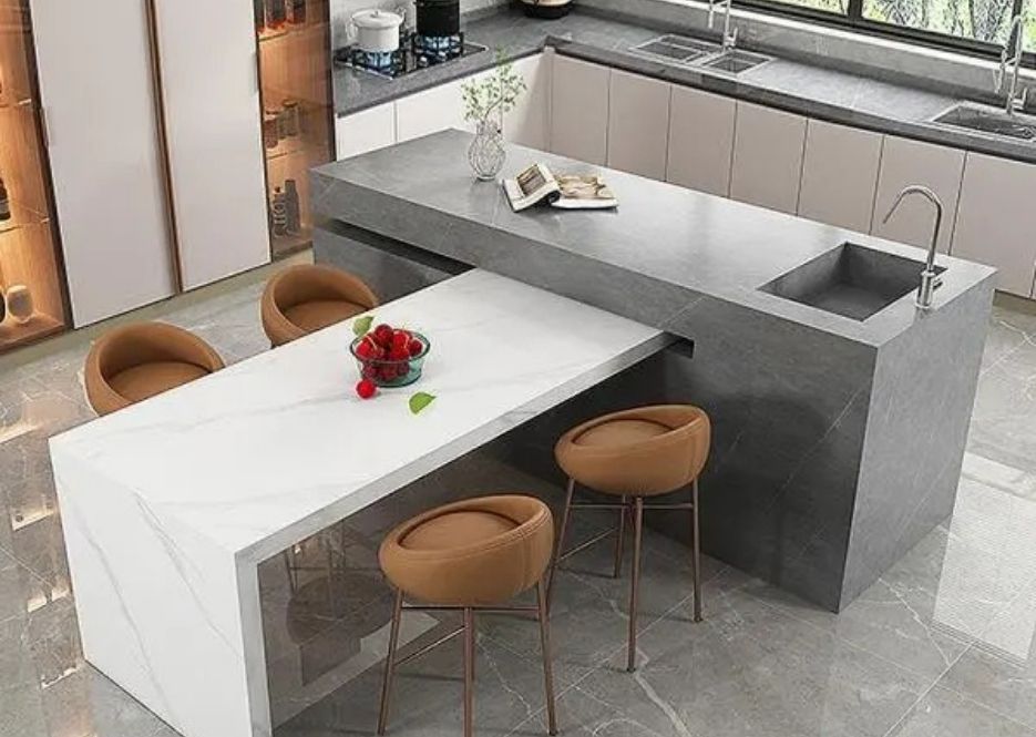 Mặt bàn bếp, đảo bếp: Đá Solid Surface giúp không gian bếp sang trọng và hiện đại.