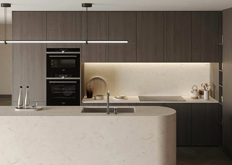 Mặt bàn bếp & đảo bếp: Độ bền cao, chống thấm nước, chống bám bẩn và dễ dàng vệ sinh, giúp không gian bếp luôn sạch sẽ, hiện đại.